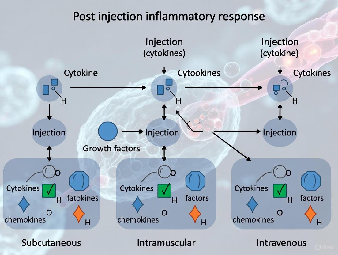 This comprehensive review synthesizes current understanding of inflammatory responses triggered by diverse injection modalities, from innovative vaccine platforms to localized drug delivery systems. We examine foundational immunobiology, including innate immune activation pathways and cytokine profiles, across mRNA vaccines, intra-articular injections, and advanced polymeric systems. The article details methodological applications in rheumatoid arthritis, aesthetic medicine, and vaccinology, while addressing troubleshooting strategies for adverse events and optimization through biomaterial engineering. By validating and comparing response patterns across delivery methods, this resource provides researchers and drug development professionals with critical insights for designing safer, more effective therapeutic and prophylactic interventions with minimized inflammatory complications.